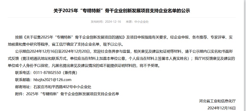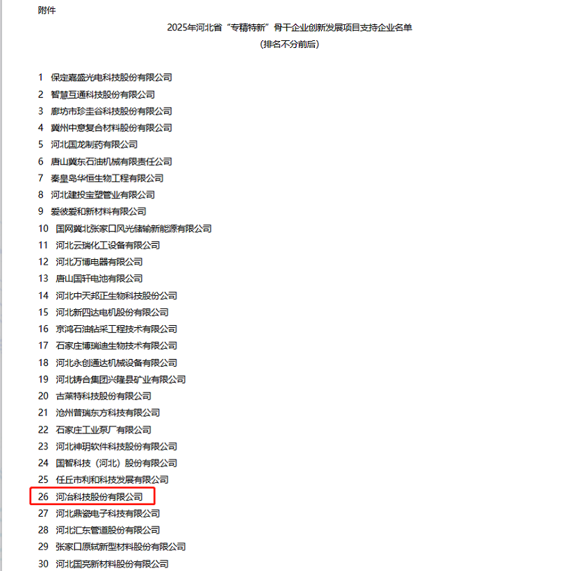 近日,公司憑借在專業(yè)領(lǐng)域內(nèi)的持續(xù)深耕與創(chuàng)新,再度榮獲河北省“專精特新”示范企業(yè)認(rèn)定。這一榮譽(yù)的再次獲得,不僅是對(duì)公司長期以來堅(jiān)持專業(yè)化、精細(xì)化、特色化、新穎化發(fā)展道路的肯定,更是對(duì)公司不斷創(chuàng)新、追求卓越精神的認(rèn)可。